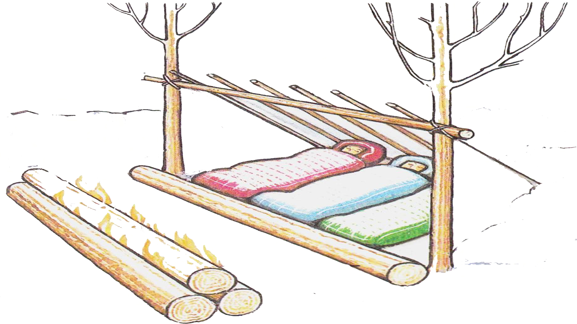 Чтобы во сне не скатиться с лежака в костер на расстоянии 1 метра от огня стоит уложить бревно, а с наветренной стороны на расстоянии 2-3 метров, нагрести снежный вал высотой 50-70 сантиметров, для отражения тепла. Так же для экрана можно использовать кусок ткани, растянув его на трех кольях под углом 50 градусов. С веток деревьев, под которыми устроена лежанка, предварительно нужно стряхнуть снег.